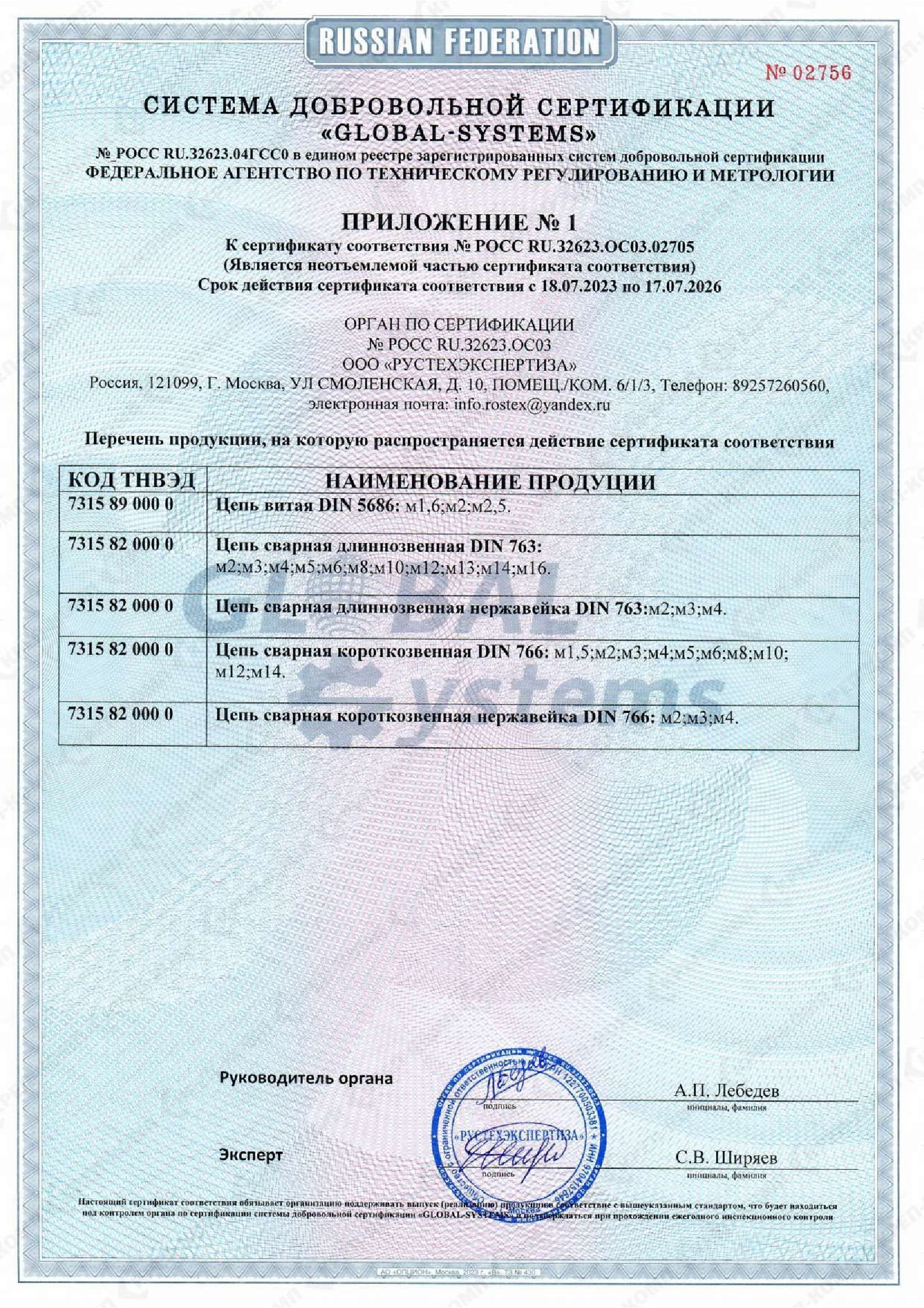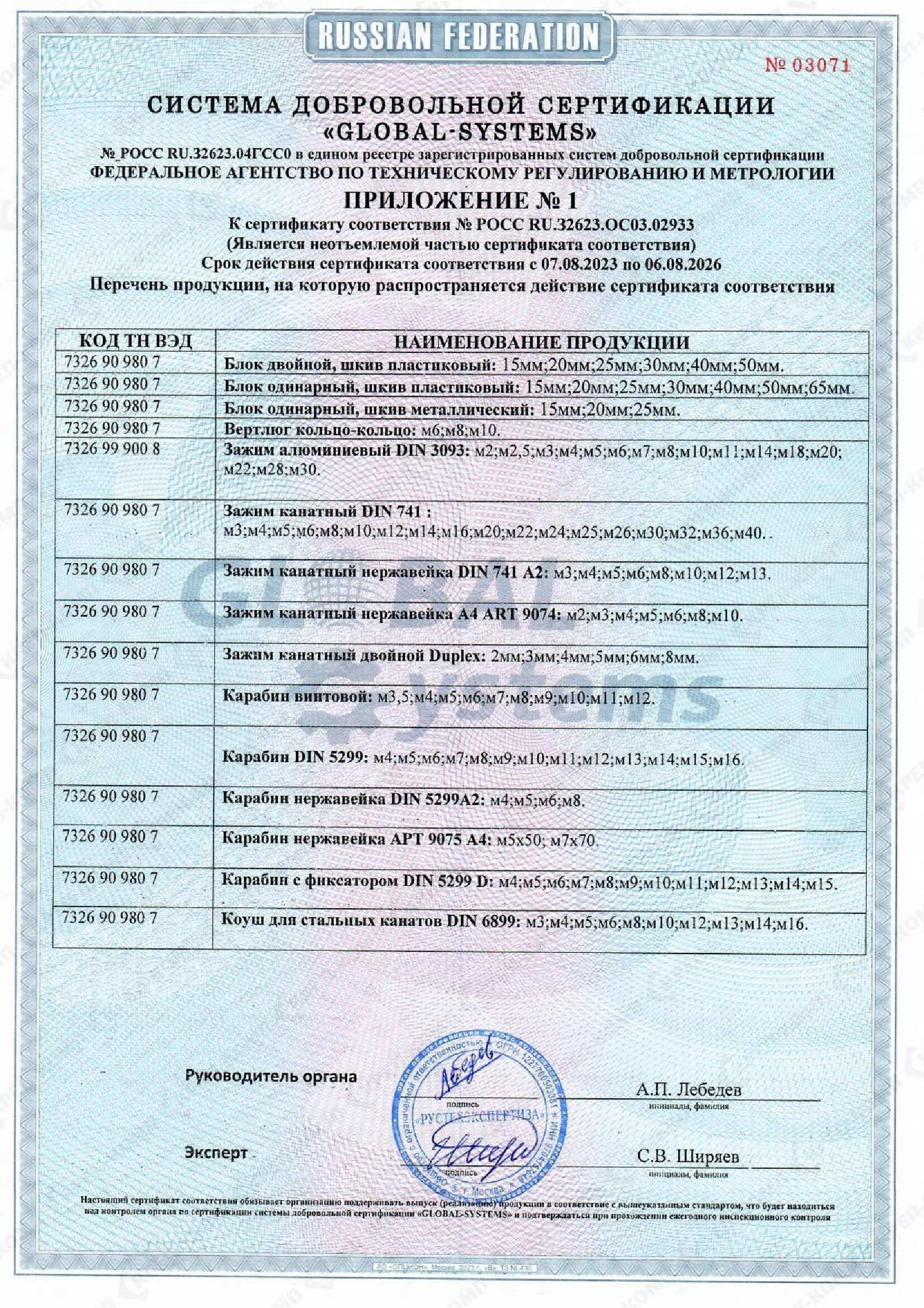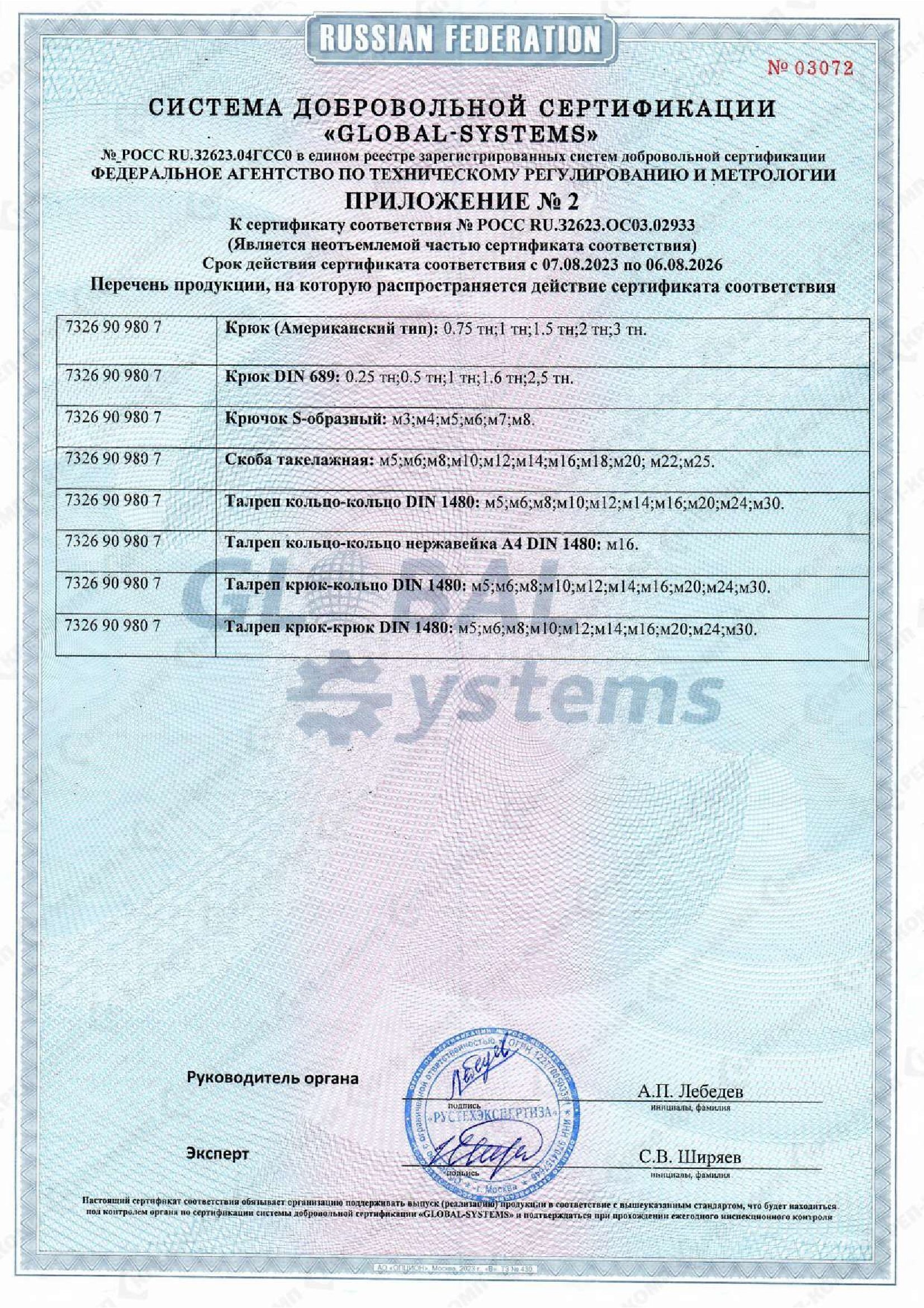 • Сертификат соответствия на такелаж