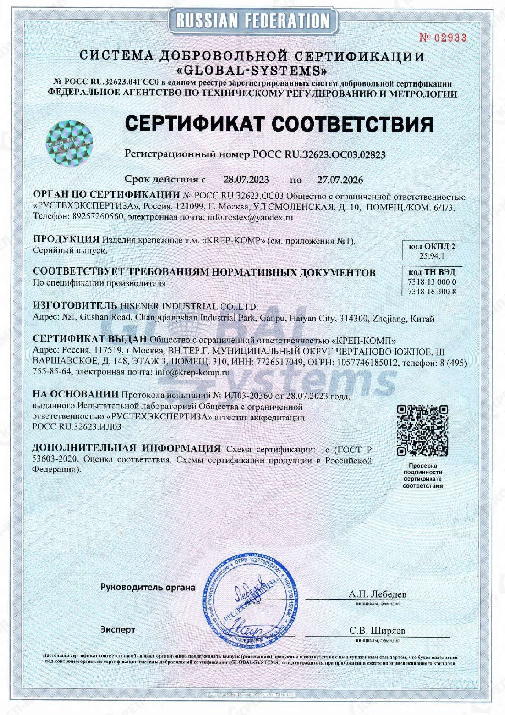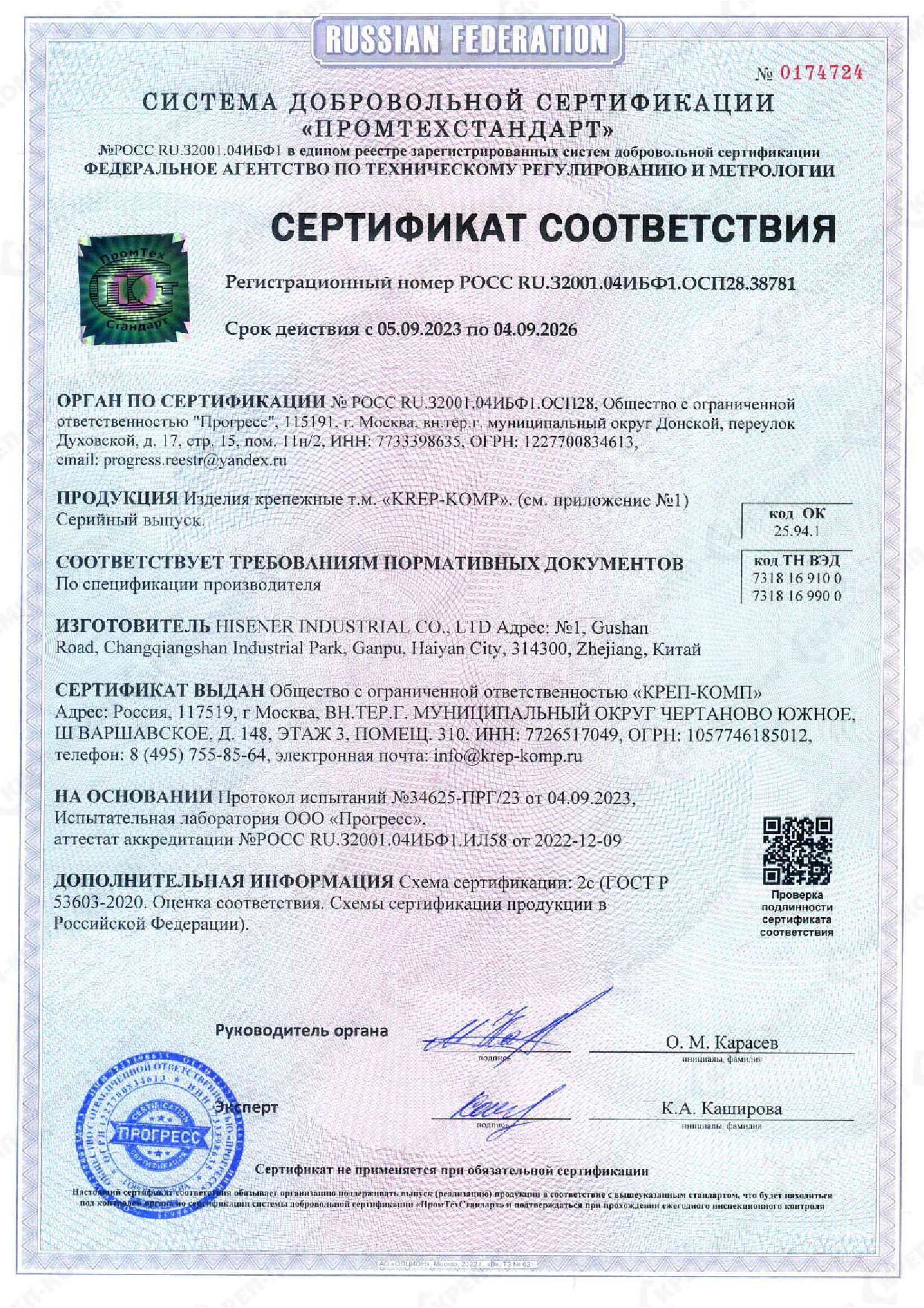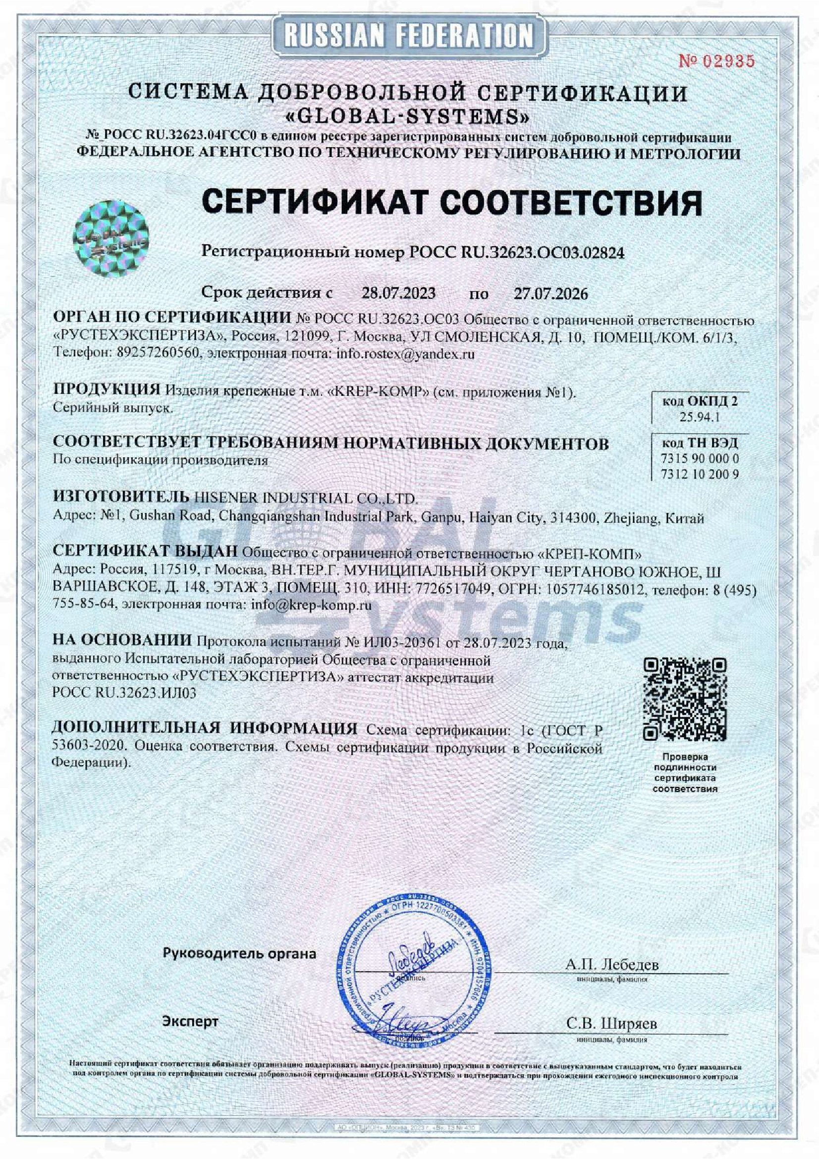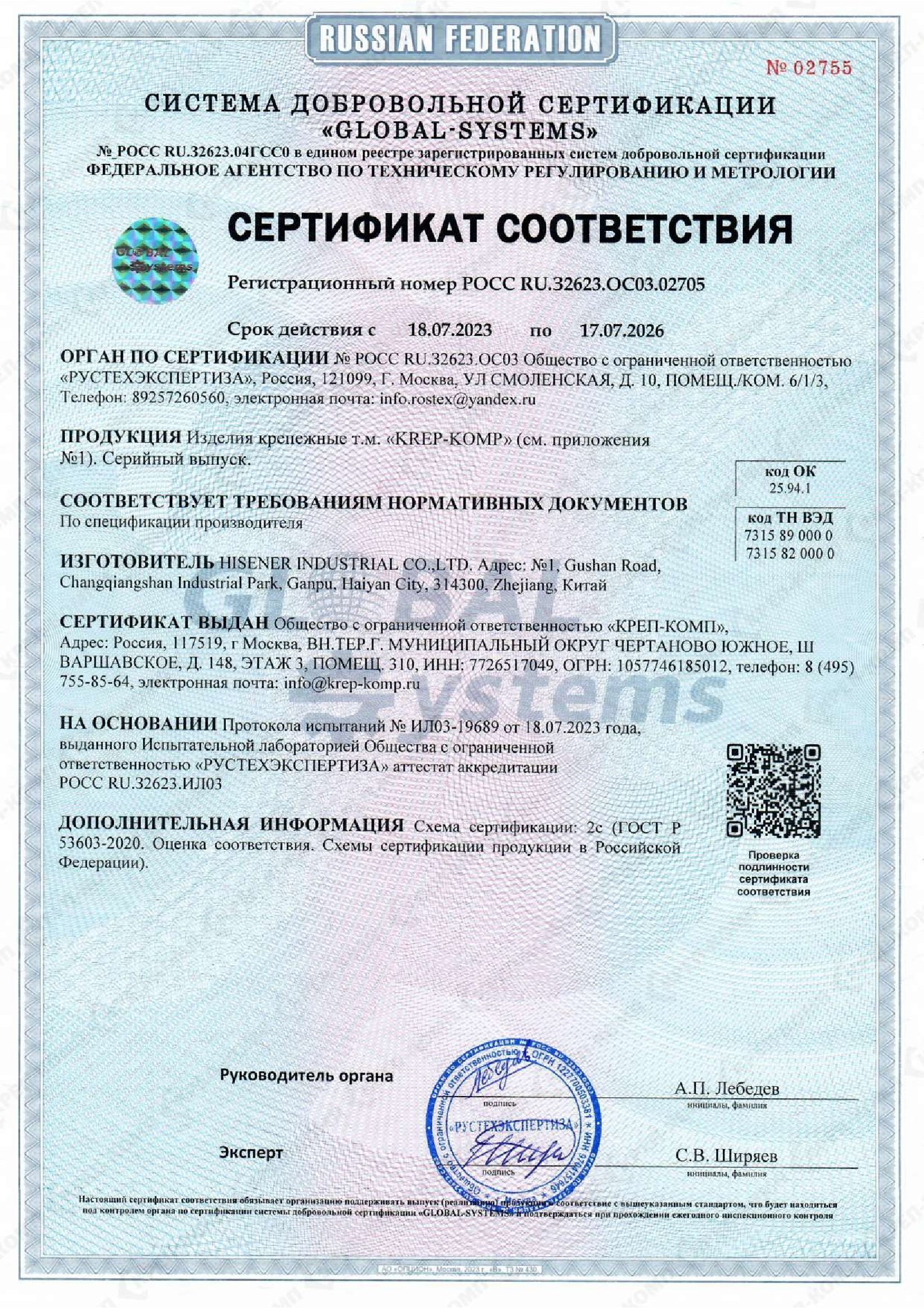 • Сертификат соответствия на такелаж